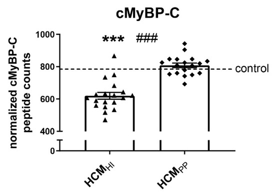 cMyBP-C haploinsufficiency. Mass spectrometry-based proteomics analysis revealed lower levels of cMyBP-C in HCMHI (n = 19) compared to controls (n = 5) and HCMPP (n = 18). Each dot on the scatter plot represents an individual sample. *** p < 0.001 versus controls and ### p < 0.001 versus HCMPP.