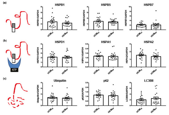Pathomechanism of HCM and key PQC players. (a) Stabilizing HSPs (HSPB1, HSPB5, HSPB7), (b) HSPs with refolding capacity (HSPD1, HSPA1 HSPA2) and (c) degradation markers (ubiquitin, p62, LC3BII) were not significantly different between HCMHI (n = 19) and HCMPP (n = 19). Each dot in the scatter plots represents an individual sample. Figure reproduced and adapted with permission from Dorsch, L.M. et al., Pflügers Archiv–European Journal of Physiology; published by Springer Berlin Heidelberg, 2018.