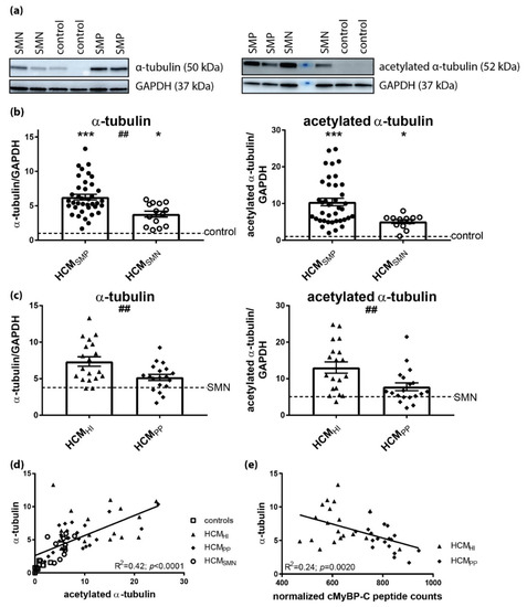 Pathomechanism of HCM and acetylation of α-tubulin. (a) Representative blot images for α-tubulin and acetylated α-tubulin. (b) Higher levels of α-tubulin and acetylated α-tubulin in HCMSMP (n = 38) and HCMSMN (α-tubulin: n = 14; acetylated α-tubulin: n = 12) compared to controls. Significant difference of α-tubulin levels between HCMSMP and HCMSMN (##p < 0.01). (c) Higher levels of α-tubulin and acetylated α-tubulin in HCMHI (n = 19) than HCMPP (n = 19). (d) The levels of α-tubulin correlated well with acetylated α-tubulin (e) Significant inverse linear correlation of α-tubulin with cMyBP-C. Controls = open squares, HCMSMP = filled circles, HCMSMN = open circles, HCMHI = filled triangles, HCMPP = filled rhomboids. Each dot in the scatter plots and the correlation analyses represents an individual sample. * p < 0.05 and *** p < 0.001 versus controls and ## p < 0.01 and ### p < 0.001 versus HCMPP.