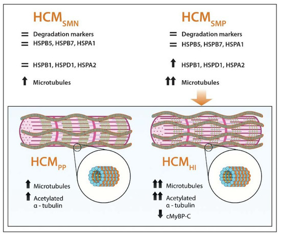 Our protein analyses revealed significantly increased levels of α-tubulin in both HCM groups (Figure 6A), which correlated with an increase in α-tubulin acetylation and the levels of all HSPs. Changes of microtubules distribution occurred at the onset of hypertrophy [90]. In chronically hypertrophied hearts, the increase of microtubules has been shown to be a major cause of contractile defects [91]. Two different hypotheses may explain microtubule densification: (1) microtubules may be involved in myofibrillogenesis and an increase in microtubules would be required when new myofibrils are formed in hypertrophied cardiomyocytes, and (2) microtubules may be intracellular compression-bearing elements needed to cope with increased contractile stress on cardiomyocytes [92,93]. In failing human hearts, the accumulation of microtubules impedes sarcomere motion and contributes to a decreased ventricular compliance [94]. Our results are in line with literature, showing an increase in α-tubulin in the HCM myocardial tissue [95]. The underlying pathomechanism seems to have an effect on extent of increase in α-tubulin and acetylated α-tubulin, since we observed the largest increase in samples with haploinsufficiency for cMyBP-C.