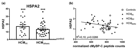 The Western blot analysis showed higher levels of HSPA2 in HCMSMP compared to controls. In our mass-spectrometry-based proteomics study, HSPA2 was highly upregulated in cardiac disease (Figure 8A) [64]. HSPA2 has been reported in heart tissue and low expression was identified in fibroblasts [60,79]. Recently, HSPA-family chaperones have been suggested to interact with cMyBP-C to regulate its turnover [80]. Moreover, a significant inverse linear correlation was present between cMyBP-C protein levels and HSPA2 (Figure 8B). Therefore, HSPA2 may be an additional regulator of cMyBP-C. Further experiments are warranted to explain the role of HSPA2 in haploinsufficiency for cMyBP-C.