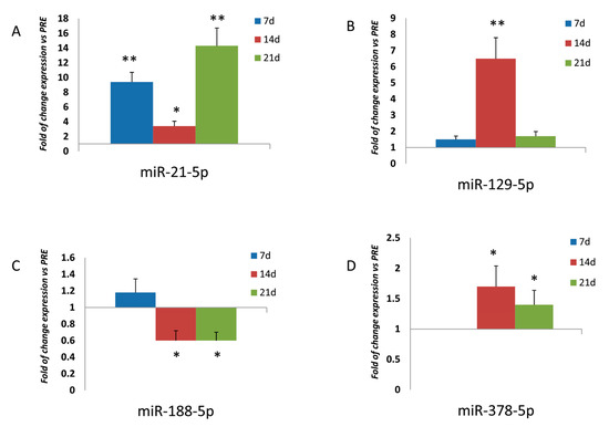 miR-21 expression was upregulated in MSCs treated with POST RUN sera during the differentiation (A); miR-129-5p was significantly upregulated only after 14 days of differentiation (B); MiR-188-5p was downregulated after 14 and 21 days of differentiation (C). In contrast, miR-378-5p resulted upregulated after 14 and 21 days of differentiation (D). Data were obtained from three independent experiments * p < 0.05 and ** p < 0.01.