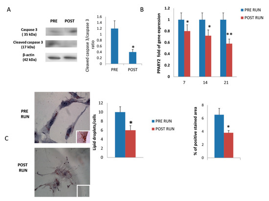 Cleaved caspase-3/caspase-3 ratio was reduced in MSCs treated with POST RUN sera (A) PPARG was downregulated in MSCs treated with POST RUN sera (B). The reduced adipogenic commitment was confirmed by a reduced number of lipid droplets for cells as well as the % of Oil Red O positive stained area (C). Data were collected from three independent experiments. * p < 0.05 and ** p < 0.01.