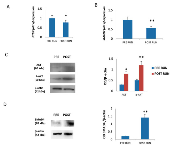 Downregulation of PTEN (A) and SMAD7 (B) mRNAs was observed in MSCs treated with POST RUN sera. Western Blot analyses showed increased levels of total AKT (C) as well as of SMAD4 proteins (D). Data were collected from three independent experiments. * p < 0.05 and ** p < 0.01.