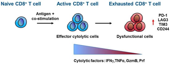 - Wherry, E.J.; Ha, S.-J.; Kaech, S.M.; Haining, W.N.; Sarkar, S.; Kalia, V.; Subramaniam, S.; Blattman, J.N.; Barber, D.L.; Ahmed, R. Molecular Signature of CD8+ T Cell Exhaustion during Chronic Viral Infection. Immunity 2007, 27, 670–684. [Google Scholar] [CrossRef]