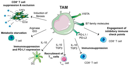 TAMs can express PD-1 ligands PD-L1 and PD-L2, as well as CTLA-4 ligands CD80 and CD86. PD-L1 and PD-L2 are up-regulated in macrophages in response to different stimuli including cytokines and hypoxia [74,75]. A high level of PD-L1 expression in TAMs has been reported for different types of cancer such as hepatocellular carcinoma [76], glioblastoma [77], pancreatic cancer [78]. Interestingly, in a pre-clinical model of pancreatic cancer, macrophages are the main source of PD-L1 within the TME [79]. In melanoma and pancreatic cancer, CD68+ TAMs can exert their immunosuppressive functions by expressing VISTA [80]. TAM secreted TGFβ directly suppresses CD8+ T cell functions by transcriptional repression of genes encoding functional cytokines such as perforin, granzyme and cytotoxins [81]; TAM derived TGFβ [82] and IL-10 [83] can also act indirectly by stimulating the differentiation of Treg cells. IL-10 stimulates PD-L1 expression on DCs [84] or it can suppress DCs anti-tumour function by inhibiting their secretion of IL-12 [85]. In addition, amino acid metabolism induced in M2-like macrophages or TAMs is responsible for arginase activity and/or production of immunosuppressive metabolites via the indoleamine 2,3-dioxygenase (IDO) pathway, resulting in metabolic starvation of T cells [86].