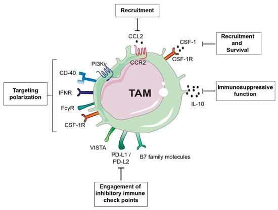 Tumour-associated macrophage (TAM)-targeted therapeutic approaches. TAM-centered approaches either aim at inhibiting TAM recruitment and survival or they focus on promoting TAM anti-tumorigenic activity. For example inhibition of the monocyte chemoattractant chemokine (C-C motif) ligand 2 (CCL2) or its receptor, as well as blockade of colony stimulation factor (CSF-1)/CSF-1 receptor (CSF-1R) axis can prevent TAM accumulation at the tumour site or TAM survival. CSF-1/CSF-1R blockade can also have the potential to switch TAM phenotype from a pro-tumorigenic M2-like to a pro-inflammatory M1-like. Similarly, approaches aimed at re-educating TAMs toward an anti-tumorigenic phenotype are successful as in the case of the use of inhibitors of gamma isoform of phosphoinositide 3-kinase (PI3Kγ) or Ig receptor gamma (FcRγ). Interferon gamma (IFNγ) administration or activation of the stimulatory receptor CD40 using anti-CD40 antibody agonists can induce re-education of pro-tumorigenic TAMs. Another alternative approach is the targeting the immunosuppressive function of TAMs by inhibiting IL-10 or blockade of immune checkpoint receptors engagement.