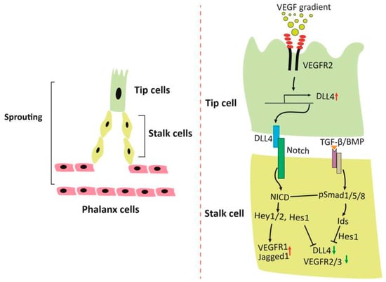 Notch plays pivotal roles in selection of the trailing stalk cells behind the tip cells [10,13]. As illustrated in Figure 1, VEGF in the hypoxic environment stimulates expression of delta-like ligand 4 (DLL4) in the leading tip cells that binds to and activates Notch receptor in the adjacent trailing stalk cells, causing its cleavage, release from the plasma membranes and translocation into the nucleus (Notch intracellular domain, NICD). NICD triggers transcription of target genes including Hey1, Hey2, Hes1, leading to downregulation of VEGFR2, VEGFR3 and DLL4, and upregulation of VEGFR1. The downregulation of VEGFR2/3 maintains the phenotype of the stalk cells, while the downregulation of DLL4 minimizes the activation of Notch signaling in the tip cells [14,15,16]. VEGFR1 is a decoy receptor that binds VEGF with high affinity, but has low tyrosine kinase activity, and can also be converted to a soluble form. As a result, VEGFR1 competes with VEGFR2 for VEGF to inhibit angiogenic sprouting by limiting conversion of stalk cells to tip cells [17,18]. Thus, the resultant decrease of responsiveness to VEGF ensures the neighboring endothelial cells become proliferating stalk cells [13,19].