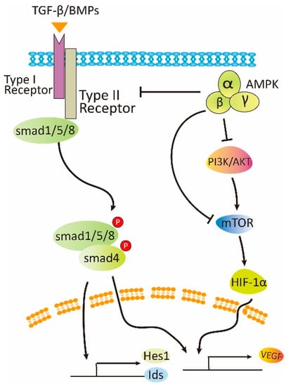 Previous studies have demonstrated that AMPK inhibits the TGF-β signaling pathway [121,122,123,124,125]. Furthermore, studies have illustrated an inhibitory role of AMPK in cancer cell migration and EMT via both TGF-β-dependent and -independent mechanisms [122,123,124,126,127,128,129,130]. Recently, we have shown that metformin inhibits Smad2/3 phosphorylation and expression of target genes involved in EMT, metastasis, and angiogenesis, including PAI-1, CTGF, as well as IL6 [131]. These effects are mainly mediated by activation of AMPK [131]. AMPK also suppresses the production of TGF-β1 in cancer cells [132]. Consistently, the serum levels of TGF-β1 in patients with type 2 diabetes receiving metformin are lower than those taking other glucose lowering medicine. Interestingly, the inhibitory effect of AMPK on TGF-β signaling is not just limited to Alk5/Smad2/3 paradigm, but also extends to BMP/ALK1/2/Smad1/5 signaling [82,133]. We have recently found that metformin inhibits ALK1-mediated tube formation and angiogenesis in matrigel plug assay [133]. The inhibitory effect is possibly mediated by proteosomal degradation of the ALK receptor involving Smurf-1/Smad6 interaction [133]. Furthermore, our study has shown that choroid neovascularization induced by laser photocoagulation is inhibited by metformin, which correlates with the reduction of ALK1 [82]. Altogether, these studies highlight targeting ALK1 can inhibit angiogenesis and tumorigenesis complementary to anti-VEGF therapies and activation of AMPK can have a double hit effect [134].
