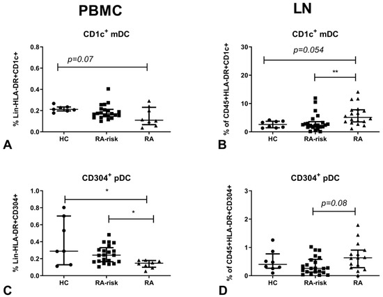 Figure 1. Myeloid (mDC and plasmacytoid(p)DC frequencies in lymphoid tissue and peripheral blood. Frequencies of mDCs (A,B) and pDCs (C,D) are determined in peripheral blood mononuclear cells (PBMC; A,C) and lymphoid tissue (LN; B,D). For PBMC, the frequencies are plotted as frequencies of the lineage (Lin)-HLA-DR+ population. For lymph nodes (LNs) the frequencies are plotted as frequencies of the CD45+HLA-DR+ population. PBMC: HC (n = 7), RA-risk (n = 21) and RA (n = 8). LN: HC (n = 8), RA-risk (n = 22), RA (n = 15 or 18). Data are presented as median with interquartile range (IQR). For statistical analysis, a Kruskall–Wallis test was performed and significant differences were determined using a post Dunn’s multiple comparisons test and indicated as * p < 0.05 or ** p < 0.01.
