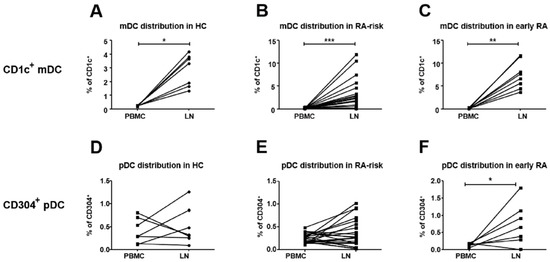 Figure 2. Frequency of mDCs and pDCs in human lymphoid tissue versus peripheral blood. Paired analysis was performed to determine the distribution of mDCs (upper panel, A, B and C) and pDCs (lower panel, D, E and F) in PBMC and LNs of HCs (A and D), RA-risk (B and E) and RA (C and F) individuals. HC (n = 7), RA-risk (n = 21) and RA (n = 8). DCs in PBMC were defined as Lineage-HLA-DR+CD1c+ or CD304+, while DCs in LN tissue were defined as CD45+HLA-DR+CD1c+ or CD304+. For statistical analysis, paired data were analyzed with a Wilcoxon matched pairs test (* p < 0.05 or ** p < 0.01, *** p < 0.001).