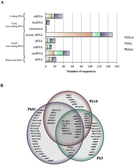 (A) Graph showing the number of sequences in each class of RNA identified in EV preparations from Pb18, Pb3 and Pb01. (B) Venn diagram showing all ncRNA sequences found in EV preparations from Pb18, Pb3 and Pb01.