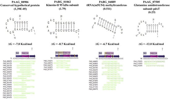 In our previous publication [21], we identified putative miRNA-like (milRNA) sequences in fungal EVs that aligned with mature miRNA following a search in the miRNA database of all organisms (http://www.mirbase.org). In the present work, we searched for sRNA sequences (up to 50 nt) bearing secondary structure in order to have a more precise view of the presence of milRNA in Paracoccidioides EVs. We applied the secondary structure analysis to RNA fragments detected in EVs at high abundance (RPKM > 5000) and for further characterization we selected 42 RNA sequences bearing secondary structures with free energy values below −3.0 Kcal/mol. The sequences with the most negative values are shown in Figure 2. We performed an alignment with these 42 sequences to infer their function and identify in which strand they would align (Supplemental Table S1). Two were present in all EV samples, while 23 were found in both Pb3 and Pb01 EVs. Interestingly, 50% of the structured RNAs aligned at the complementary strand of the RNA, thus suggesting that they could act as miRNA or the transcripts (Supplemental Table S1). Most of the structured RNAs localize to transcripts that code for hypothetical proteins, however we could also identify RNAs that align to transcripts of kinesin-II, glutamine amidotransferase and lysine methyltransferase (Figure 2).