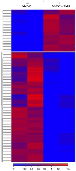 Heat map of transcripts from MoDC cells that were modulated over 2-fold and had a p-value < 0.05 when co-cultivated indirectly with Pb18 in a transwell system.