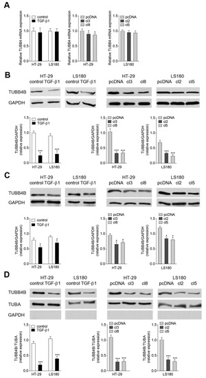 Induction of epithelial-mesenchymal transition (EMT) in colon cancer cell lines results in TUBB4B downregulation. (A) The expression of tubulin-β4 (TUBB4B) was determined in controls, TGF-β1-treated HT-29 and LS180 colon cancer cell (left panel), empty vector- and stable Snail-transfected HT-29 (cl3, cl8) (middle panel) and LS180 (cl2, cl5) clones (right panel). The relative mRNA level of TUBB4B was normalized to glyceraldehyde 3-phosphate dehydrogenase (GAPDH). (B) The protein levels in the whole cell lysates were evaluated by Western blot assay using a mouse monoclonal anti-TUBB4B antibody. The quantity of the TUBB4B protein was normalized to GAPDH. (C) Equal amounts of cytosol and (D) cytoskeleton cell fractions were analyzed by Western blot using monoclonal mouse anti-TUBB4B antibodies. Protein level was normalized to GADPH for the cytosol (C) and to alpha-tubulin (TUBA) for the cytoskeleton (D). Additionally, to confirm the purity of cytoskeleton fraction isolation, the presence of GAPDH was analyzed (D). Statistical variability was measured relative to control (left panel B,C,D) or stable pcDNA3.1 plasmid-transfected cells (right panel B,C,D); n = 3; * p < 0.05, *** p < 0.005.