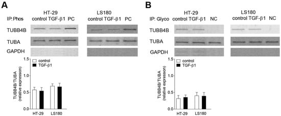Further, we assessed the posttranslational modifications of TUBB4B in colon cancer cells undergoing EMT. We evaluated two modifications within this tubulin subunit located in the microtubules—phosphorylation (Figure 2A) and glycosylation (Figure 2B). The alterations within TUBB4B were examined in the microtubular fraction by immunoprecipitation assay of serine residues with P-Ser antibody recognizing phosphorylated proteins, or an antibody that binds to glycolyzed fragment of each protein. This was followed by Western blot with an antibody specifically recognizing TUBB4B. We also analyzed the level of TUBA in the microtubular fraction before immunoprecipitation as a control for the total protein content of the experiment. Additionally, GAPDH levels were evaluated to check the purity of isolated microtubular fraction. Surprisingly, our studies revealed that stimulation by TGF-β1 did not induce any changes in the level of TUBB4B phosphorylation (Figure 2A) or glycosylation (Figure 2B) in both colon cancer cell lines HT-29 and LS180 studied. As a positive control (PC) of phosphorylation modulation, we used lysate from the cells treated with a mix of Phosphatase Inhibitor Cocktail 1–4 (according to manufacturer’s instruction) which block protein dephosphorylations. Negative control (NC) of glycosylation was the cell lysate treated with tunicamycin that blocked glycosylation of tubulin in microtubules.