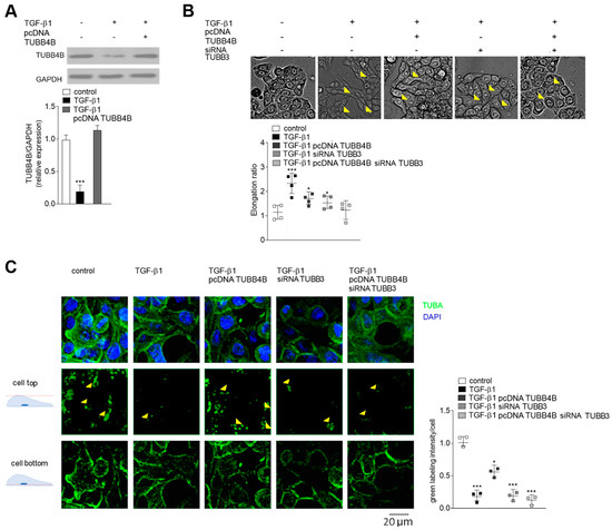 In the next step of our studies, we focused on understanding the role of TUBB4B during EMT (Figure 3). Since stimulation by TGF-β1 reduced the level of TUBB4B, we restored it by transient transfection of the TGF-β1-stimulated HT-29 cells with a vector carrying TUBB4B (pcDNA-TUBB4B; Figure 3A). The microscopic studies revealed that HT-29 cells stimulated by TGF-β1 become elongated but after TUBB4B expression, this process was reversed, although not completely (Figure 3B). Calculated elongation ratio was 2.3 times higher in TGF-β1 stimulated cells and 1.7 times higher in TUBB4B expressing cells as compared to control, unstimulated HT-29. As we previously described TUBB3 is upregulated during EMT in Snail-expressing CRC lines [22]. Thus, in the next set of studies, we silenced TUBB3 expression in TGF-β1-stimulated HT-29 cells both in the absence or presence of pcDNA-TUBB4B. According to previous analyses, we used 100 nM TUBB3 siRNA [22], and in each case, TUBB3 was silenced by approximately 0.75 (Figure S2A,B). Additionally, the Western blot analysis with antibodies recognizing other tubulin subunits (TUBB1, TUBB3, TUBB4B, TUBB6) confirmed the specificity of the siRNA sequences (Figure S3). Lowering TUBB3 expression resulted in a reduction of elongation ratio (1.5 times as compared to control) shifting the cell shape toward more rounded (Figure 3B). Simultaneous decrease of TUBB3 and increase of TUBB4B in the TGF-β1-stimulated HT-29 cells resulted in the decrease of elongation ratio that reached the same levels as control, unstimulated/pre-invasive HT-29 cells. Further confocal microscopy studies showed that TUBB4B presence affected the accumulation of microtubules (calculated as a green intensity level) in the basal parts of TGF-β1-stimulated HT-29 cells (Figure 3C). Silencing of TUBB3 (by siRNA) in TGF-β1-stimulated cells caused a similar accumulation and the cells were still loose, suggesting that the disruption of cell-cell interactions was a result of decreased TUBB4B level (Figure 3C). In agreement with this hypothesis, the analysis of green labeling intensity of upper scans of the cell showed about 0.5 lower green intensity in cells overexpressing TUBB4B. That effect was even stronger (0.75 decrease) in the cells with silenced TUBB3. The modulation of both tubulin subunit levels (TUBB3 silencing and TUBB4B overexpression) resulted in almost complete inhibition of the TGF-β1 effects (Figure 3B,C).
