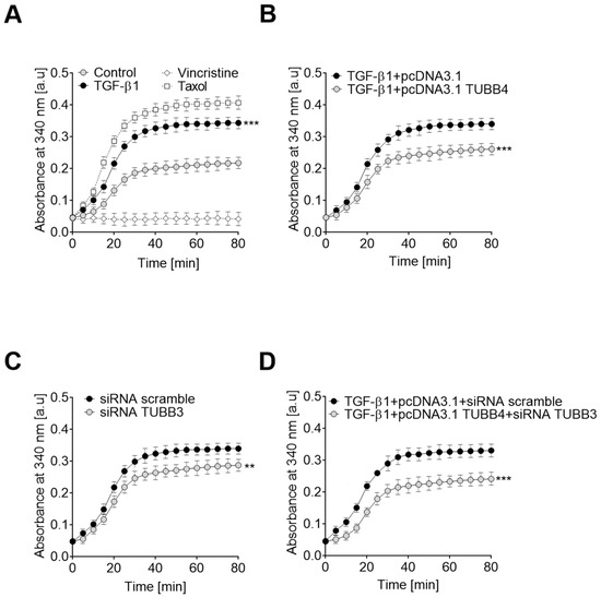 Modulations of TUBB4B and TUBB3 levels are critical for the rate of microtubule polymerization during EMT. The changes in microtubule polymerization were analyzed (A) in control and TGF-β1-stimulated HT-29 cells. Control cells were also treated with Taxol and vincristine-10 µM in both cases, (B) TGF-β1-stimulated HT-29 cells transfected with pcDNA and pcDNA/TUBB4B, (C), scramble and TUBB3 siRNA treated control HT-29 cells, and (D) both pcDNA/TUBB4B and siRNA TUBB3 treated TGF-β1-stimulated HT-29 cells. Results are plotted as the extent of tubulin polymerization (A340 nm) and a function of time and represent means of triplicate determinations at each time point. For graphic clarity, only data points from odd-numbered minutes are presented. ** p < 0.01, *** p < 0.005, relative to following controls: (A) non-stimulated cells TGF-β1-stimulated HT-29 cells transfected with empty pcDNA3.1 plasmid, (B) scramble siRNA treated HT-29 cells (C) or TGF-stimulated HT-29 treated with empty pcDNA3.1 plasmid and scramble siRNA (D); n = 5 * p < 0.05, *** p < 0.005.