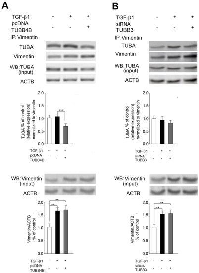 It has been established that the location of microtubules in mesenchymal cells is regulated by vimentin [21]. Thus, we analyzed the role of TUBB4B downregulation and TUBB3 upregulation during EMT, in the interaction between vimentin and microtubules in TGF-β1-stimulated HT-29 cells (Figure 5). To study the interaction of tubulins with vimentin, we performed the co-immunoprecipitation of the protein lysates obtained from control and TGF-β1-stimulated cells with an antibody against vimentin. It was followed by Western blot analysis with an antibody that binds TUBA. To check whether downregulation of TUBB4B in EMT is responsible for interaction between vimentin and microtubules, we restored the TUBB4B level by transfecting the TGF-β1-stimulated cells with pcDNA-TUBB4B (Figure S4). In such cells, we observed about 0.28 lower level of immunoprecipitated complex of TUBBA-vimentin (normalized to immunoprecipitated vimentin) in comparison to only TGF-β1 stimulated cells, suggesting that TUBB4B regulates the interaction of vimentin with tubulins. (Figure 5A). In contrast, reversing of TUBB3 upregulation by silencing with siRNA/TUBB3 (Figure S2D) did not affect the changes in the level of microtubule-vimentin complex (Figure 5B).