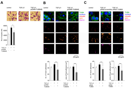 Modulation of TUBB3 and TUBB4B is critical for the regulation of cell migration through induction of focal adhesion maturation during EMT in colon cancer cells. (A) Transmigration of control (white bar), TGF-β1-stimulated (black bar), and TGF-β1-stimulated/pcDNA TUBB4B transfected (gray bar) - HT-29 cells towards collagen was determined. Error bars represent the SD from three independent experiments; n = 3; * p < 0.05. (B,C) show the number and size of focal adhesions that were calculated in control and in the TGF-β1-stimulated mock or pcDNA TUBB4B transfected cells and in the presence of scrambled and TUBB3 specific siRNA, respectively. Cells were stained with antibodies against vinculin connected with Alexa 633, talin connected with Alexa 543; filamin connected with cy5. The analysis of size and number of focal adhesions labeled with vinculin was made in ImageJ software on inverted colored pictures. Error bars represent the SD from three independent experiments; n = 3; *** p < 0.005. Statistical variability was measured relative to TGF-β1 stimulated cells. + with and – without as indicated in the Figure.