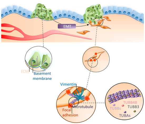 The molecular mechanism and the role of particular tubulins in the EMT process are still unknown. Therefore, we focused on the role of TUBB4B downregulation and TUBB3 modulation in microtubule polymerization during EMT in colon cancer progression. It has been known that tumor growth factor-beta 1 (TGF-β1) and Snail are the main stimulators of EMT. We used a model of pre-invasive colon cancer cell (CRC) lines (HT-29 and LS-180) with EMT induced by either TGF-β1 stimulation or by stable expression of the Snail transcriptional factor. Based on our results, we conclude that microtubule-intermediate filament interactions are critical for the EMT process in colon cancer and that therapies based on microtubule reorganization supplemented with chemotherapeutics directed against vimentin might be more effective in cancer treatment in the invasive stages.