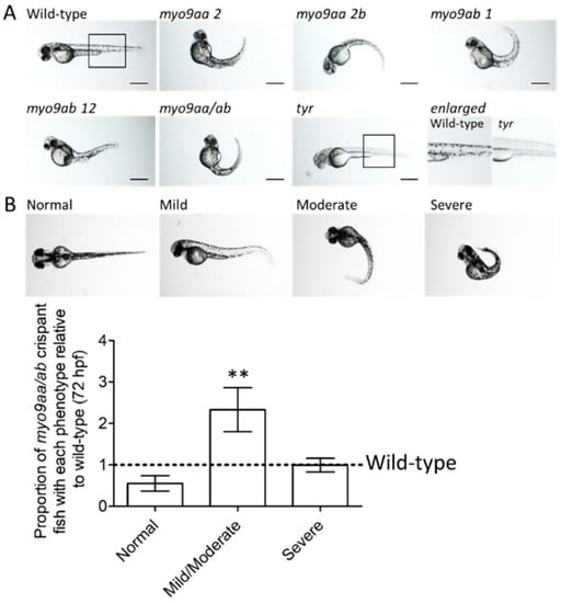 Phenotypes of myo9aa/ab crispant zebrafish. (A) Representative images of 48 hpf zebrafish injected with sgRNAs against myo9aa and myo9ab (numbers following the gene refer to exon targeted). Injection of a combination of all four sgRNAs was performed (myo9aa/ab), along with a control against the tyrosinase gene (tyr) in which no pigment can be observed, confirming knockdown success. Scale bar = 500 µm. (B) Images showing phenotypic classification of injected zebrafish at 72 hours post fertilisation (hpf), ranging from normal to severe. Graph shows proportion of myo9aa/ab crispant fish injected with all four sgRNAs (n = 7, including 160 fish in total) as compared to wild-types (black line, n = 7, including 138 fish in total). Error bars represent mean ± S.E.M, ** p < 0.01, paired t-test.