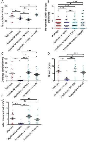 In the hours that follow the initial outgrowth of secondary motor neurons at 27 hpf, the fish gain the ability to respond to touch by swimming away from the stimulus if removed from the chorion. This swimming response increases in frequency until 36 hpf, where it peaks []. As zebrafish generally hatch from the chorion by 48 hpf, when the touch response should have been established in all the zebrafish, this time-point was selected for performing a touch-evoked response assay. This consisted of a touch to the back of the zebrafish head using a fine pipette tip to stimulate a rapid swim away from the stimulus, which can be recorded and analysed [,]. Distance travelled following the stimulus, average speed of movement, and initial acceleration (indicative of force produced by the muscle []) were all significantly decreased in myo9aa/ab crispants, as compared to wild-type fish (Figure 2C–E). Application of both NT1654 and fasudil to myo9aa/ab crispants rescued the movement defects, significantly improving distance, speed, and acceleration to the same level as observed in wild-type zebrafish. Overall, reduction in Myo9aa/ab using CRISPR/Cas9 produced similar effects to those observed in morphants, with a reduction in chorion movements and response to tactile stimulation, without significantly affecting survival rates. Application of an exogenous agrin fragment (NT1654) or a ROCK inhibitor (fasudil) was sufficient to provide motor improvements at both time points analysed.