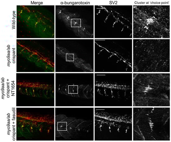 Neuromuscular junction (NMJ) morphology of myo9aa/ab crispant zebrafish at 24 hpf. Representative images of NMJs in wildtype, myo9aa/ab crispant, and NT1654 (0.15 ng) or fasudil-treated (10 µm) crispant zebrafish at 24 hpf. Acetylcholine receptors stained with αBTx (green), and motor neurons detected with an antibody against SV2 (red). White boxes demark areas enlarged in the right-hand panel, showing presence of αBTx-positive choice point clusters. Scale bar = 50 µm.