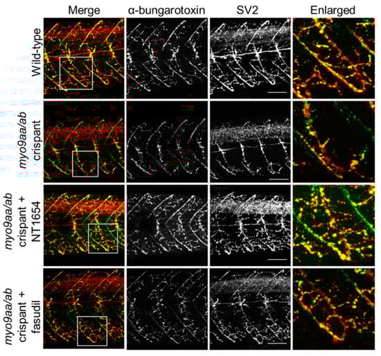 NMJ morphology of myo9aa/ab crispant zebrafish at 48 hpf. Representative images of NMJs in wild-type, myo9aa/ab crispant, and NT1654 (0.15 ng) or fasudil-treated (10 µm) crispant zebrafish at 48 hpf. Acetylcholine receptors stained with αBTx (green), and motor neurons detected with an antibody against SV2 (red). White boxes demark areas enlarged in the right-hand panel. Scale bar = 50 µm.