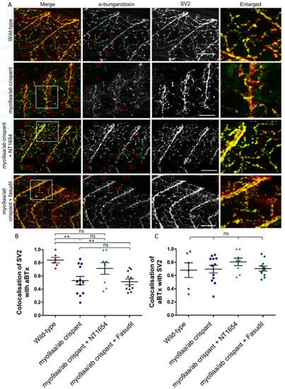 One of the benefits of using the CRISPR/Cas9 technique to reduce myo9aa/ab expression is the ability to analyse phenotypes at later time points than possible with MOs, due to the direct and permanent effects on the genomic sequence. At 120 hpf, zebrafish myotomes have a dense innervation from primary and secondary motor neurons which are in contact with AChRs. In myo9aa/ab crispant zebrafish, there were examples of sparsely innervated myotomes as shown in Figure 5A, with less complex branching than in controls. These features were improved by application of NT1654, but not by fasudil. Results are quantified in Table 3. Colocalisation between presynaptic and postsynaptic immunofluorescence was also quantified to determine the extent that the synaptic components overlay each other. Any myotome in which non-specific SV2 staining of the spinal cord was observed was not included in analysis, as can be observed with this antibody []. The amount of SV2-positive signal overlaying αBTx was significantly reduced in myo9aa/ab crispant fish, indicating that there were innervated regions lacking corresponding AChRs (Figure 5B). Application of fasudil did not improve this lack of colocalisation, with values remaining significantly below those observed in wild-type fish. On the other hand, NT1654 treatment increased the apposition of the pre- and postsynapse to a level not significantly different to wild-type. Co-occurrence of AChRs with SV2-positive signal revealed no significant differences between any treatment/genotype group, highlighting that the AChRs present were appropriately apposed with nerve terminals (Figure 5C).