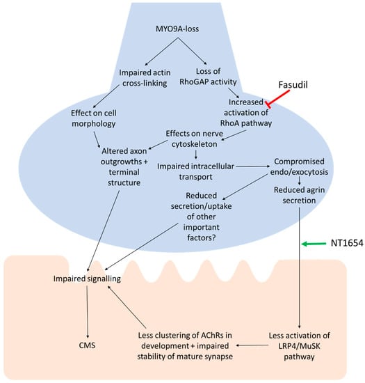 Proposed pathway of action for MYO9A-dysfunction at the NMJ. The pathway begins with loss or dysfunction of MYO9A and the predicted effect of this on a number of downstream processes, culminating in impaired neuromuscular transmission and Congenital Myasthenic Syndromes (CMS). The points of action for fasudil (ROCK inhibitor) and NT1654 (agrin-fragment) are shown. Green arrow = positive action, red arrow = inhibits action.