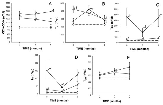 ). All values are expressed as mean cell counts ± S.E.M. *, p < 0.05 for responders or non-responders (including eventual) vs. healthy controls; †, p < 0.05 for responders vs. non-responders (including eventual), σ, p < 0.05 for values at 3 months of treatment compared to baseline, ‡, p < 0.05 at 6 months of treatment time compared to 3 months, and δ, p < 0.05 at 6 months of treatment time compared to baseline.