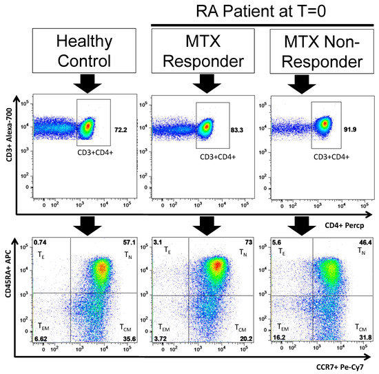 Previous studies of the activation/differentiation CD4+ T subset distribution in RA patients have shown conflicting results [21,22,23,24,25]. Several reasons may be involved in this heterogeneity such as differences in disease duration, previous and active DMARD use, immunosuppressor treatments, associated comorbidities, and genetic and epidemiological characteristics. As previously indicated, to reduce the impact of potential interferences with the mechanisms directly associated with RA pathophysiology, we investigated a clinically homogeneous population of recently diagnosed, DMARD-naïve patients with RA. Furthermore, the accuracy of the methodologies employed for the CD4+ T lymphocyte analysis have been improved such as those used in this study. Our results agree with the recently reported expansion of TN and total T effector CD4+ in RA patients without DMARDs treatment in the previous three months to the study [56]. We have found that the pattern of activation/differentiation CD4+ T subset redistribution is different in MTX responders or non-responders at basal conditions and the variations observed along the treatment give a light to the understanding of the observed variation.