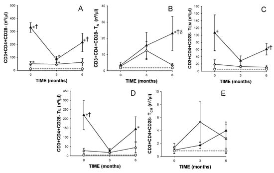 The CD4+CD28− T lymphocyte counts were significantly increased in non-responders with respect to those found in responders and healthy controls at baseline (Figure 4A). However, non-responders showed a significant reduction in the CD4+CD28− T lymphocyte counts after 3 months of MTX treatment with a significant increase after 6 months of treatment. At baseline, non-responders showed a significant increase in the counts of CD4+CD28− TEM and TE with respect to responders (Figure 4C,D). However, after 6 months of treatment, non-responders had significant higher counts of CD4+CD28− TN, TEM and TE with respect to responders.
