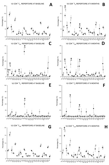 A representative dot-plot of significantly Vβ repertoire distributions in CD4+ TEM lymphocytes in a responder (panel A) and non-responder (panel B) RA patients at baseline of MTX treatment is shown in Figure 7.
