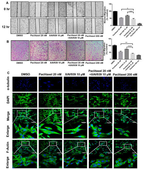 Regarding the cytotoxicity effect of the combination treatment, the scratch wound assay and invasion assay were conducted to observe the cell migration of MDA-MB-231 in the presence of paclitaxel (20 nM) and/or XAV939 (10 µM). The combination treatment with paclitaxel and XAV939 showed more inhibited cell migration compared to each single treatment with either paclitaxel (p < 0.05) or XAV939 (p < 0.0008) at 12 h, as seen in Figure 2A. Similar trends were observed in the transwell invasion assay, as seen in Figure 2B. The number of invasive cells significantly decreased in the combination treatment with paclitaxel and XAV939 after 24 h, compared to each single treatment with either paclitaxel (p < 0.001) or XAV939 (p < 0.0001). Besides, the combination treatment with paclitaxel and XAV939 and paclitaxel with a high dose (200 nM) showed a similar number of migrated cells. Overall, the combination of paclitaxel (20 nM) + XAV939(10 µM) effectively inhibited cell migration and invasion in MDA-MB-231. To assess the cell integrity of cells after the treatments with paclitaxel and/or XAV939, cells were stained with the anti-α-tubulin antibody and with phalloidin (FITC). The combination treatment with paclitaxel and XAV939 as well as a high dose of paclitaxel (200 nM) damaged the cytoskeleton and destroyed cell integrity as displayed in Figure 2C.