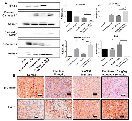 To examine the effect of paclitaxel (10 mg/kg), XAV939 (10 mg/kg), and a combination of paclitaxel (10 mg/kg) and XAV939 (10 mg/kg) on the Wnt signaling pathway and apoptotic protein expression, the Western blot and immunohistochemistry were performed on MDA-MB-231-xenografted mice tumor samples. As presented in Figure 5A, the combination treatment upregulated more significantly the protein expression of cleaved caspases 3 and cleaved PARP and suppressed the Bcl-2 expression level in tumor samples, compared to each single treatment with paclitaxel or XAV939. Moreover, the expression of Wnt signaling proteins were also measured as seen in Figure 5A,B. The combination treatment inhibited more significantly the β-Catenin expression level, compared to each single treatment with paclitaxel (p < 0.001) or XAV939 (p < 0.005), whereas the combination treatment with paclitaxel and XAV939 appeared to upregulate the expression of Axin1 in comparison with each single treatment with paclitaxel or XAV939 (Figure 5B). Overall, the results suggest that the combination treatment could suppress Wnt signaling and upregulate the apoptotic protein expression in the MDA-MB-231-xenografted tissue.