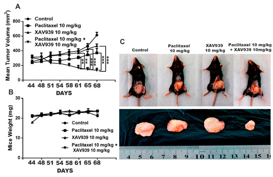Combination treatment with paclitaxel and XAV939 suppressed the pristane-induced breast tumor in an in vivo mouse model. (A) The pristane-induced tumor was generated in C57 female mice, and paclitaxel (10 mg/kg), XAV939 (10 mg/kg), and a combination of paclitaxel + XAV939 (10 mg/kg + 10 mg/kg) were injected at a pristane-induced tumor site twice a week for 4 weeks. (A,B) Mouse tumor volume and body weight were measured every two weeks. Data were presented at mean ± SD (n = 3; **: p < 0.005 and ***: p < 0.0005, compared to each single treatment with paclitaxel or XAV939). (C) After 4 weeks, mice were sacrificed, and tumors were isolated and photographed.