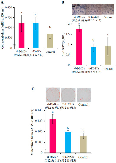 Cell metabolism was measured by a WST-1 assay. RPPCs were seeded at 5000 cells/well in a 96-well plate in culture medium (α-MEM supplemented with 1% FBS and 10 μg/mL penicillin-streptomycin) containing fractions #12 and #13 from u-DMCs or d-DMCs, or the 0.05% formic acid aqueous solution as the control (the volume percentage of each specimen was adjusted to 2% (v/v)).