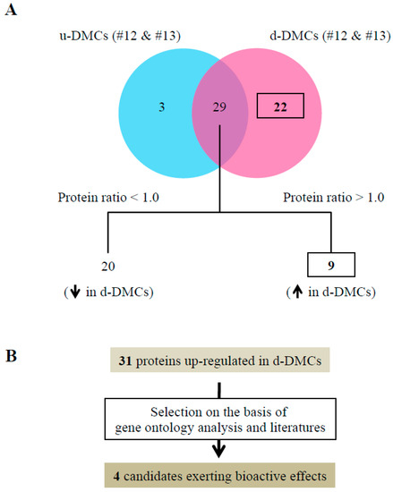 Proteomic analysis of fractions and selection of critical molecules. (A) Venn diagrams showing the results of protein identification of fractions #12 and #13 from u-DMCs or d-DMCs. Label-free proteome quantification was performed using MaxQuant software to calculate the protein ratio among 29 proteins common to both samples. Nine proteins showing a high protein ratio (>1) among 29 common proteins and 22 proteins unique to the fractions of d-DMCs were specifically increased in d-DMCs (protein ratios were calculated by the following formula: [protein ratio] = [intensity of protein in the fraction of d-DMCs]/[intensity of protein in the fraction of u-DMCs]). (B) Workflow to select candidate critical molecules for wound healing promotion. Four proteins (Table 1) were selected among 31 increased proteins based on gene ontology analysis and previous studies.