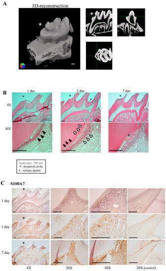 Human recombinant protein S100-A7 (PROSPEC, Ness-Ziona, Israel) or protein S100-A8 (PROSPEC) was applied to exposed pulp tissue as a pulp capping material by the same procedure described in “Animal studies using fractions of u-DMCs or d-DMCs”. In brief, each recombinant protein was diluted in PBS and adjusted to 1 μg/mL. A gelatin sponge containing 20 μL of the prepared protein samples was gently applied as a pulp capping material. As a control, we used a gelatin sponge containing 20 μL PBS. After 4 weeks, the form of newly formed hard tissue was evaluated using the µ-CT scanner, and the same histological evaluation was performed as described above (n = 3 for each group).