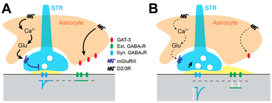 Mechanisms underlying GABAergic synaptic alterations in the GP in experimental PD. (A) In DA-intact conditions, D2 receptors present on astrocyte membranes elevate intracellular calcium levels and promote glutamate gliotransmission. Glutamate activates group III mGluR (GluRIII), which reduces GABA release probability at striato-pallidal synapses. D2Rs also regulate GAT-3 activity by an unknown mechanism, preventing GABA spillover from GABAergic synapses and hence activation of extrasynaptic GABAA receptors. (B) Under DA-depleted conditions, D2Rs are no longer activated, glutamate gliotransmission is reduced and mGluRIII-dependent reduction of GABA release is lost, leading to an increase in striato-pallidal transmission. The loss of D2R modulation of GAT-3 triggers a downregulation of the expression of the transporters, and the elevation of extracellular GABA concentrations leads to the activation of extrasynaptic GABAA receptors, which favors tonic inhibition.