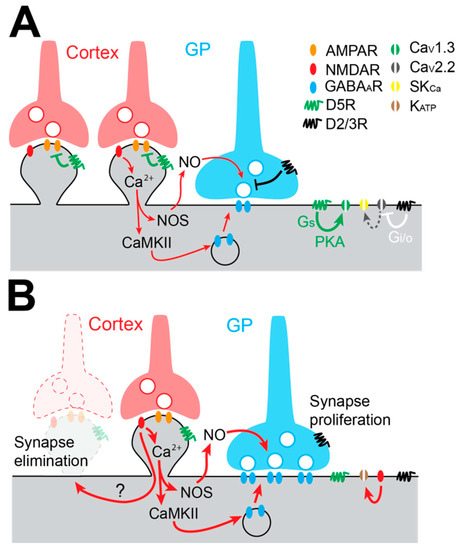 The cortico-subthalamic (Cx-STN) projection is well described anatomically. Cx-STN synapses are mainly found on the distal part of STN neurons’ dendrites [135,136]. The functional properties of Cx-STN glutamatergic synapses have been described recently. Around the resting potential of STN neurons, Cx-STN post-synaptic excitatory currents (EPSC) are mainly composed of AMPAR-mediated currents with a small NMDA component [134,137]. Interestingly, it has been shown that the strength of the Cx-STN inputs is under the control of DA and more specifically, of post-synaptic D5Rs which depress AMPAR-mediated EPSC through a PKA-dependent intracellular pathway [137]. Another study has also shown that pre-synaptic D2Rs modulate AMPA currents by decreasing glutamate release [138]. Together, these data suggest that Cx-STN synaptic transmission is modulated by DA, and hence, this pathway may be altered in PD. Indeed, it has been shown that, in DD rodents, Cx-STN innervation is reduced [139,140,141] but the mechanisms underlying this loss of Cx-STN glutamatergic inputs remain to be determined. It has been proposed that the alleviation of motor symptoms by M1 motor cortex deep brain stimulation (DBS) [142,143] relies on the restoration of Cx-STN functional connectivity of the remaining Cx-STN afferent inputs [141].