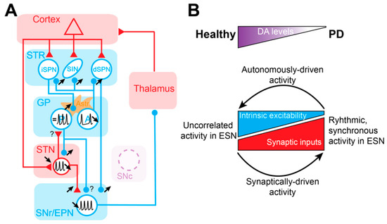 Cellular and synaptic alterations in the ESN in experimental PD. (A) Summary diagram of the main modifications in cellular excitability and synaptic transmission observed in the BG network under DA-depleted conditions. Black arrows indicate increase or decrease in synaptic transmission or intrinsic excitability (represented by black APs). Astr.: astrocyte involvement in GABAergic dysfunction in GP. GABAergic and glutamatergic projections and nuclei are depicted in blue and red, respectively. Loss of SNc DA neurons is represented by the dashed purple circle. (B) Schematic illustrating the modification in the balance between intrinsic neuronal excitability and synaptic strength in ESN as a function of the levels of DA.