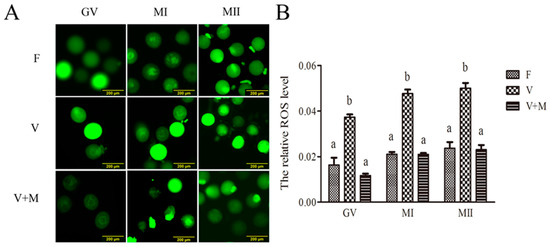 For detection of mitochondrial membrane potential, GV, MI, and MII oocytes from each group were collected and assayed using JC-1 according to the manufacturer’s guidelines (JC-1; Beijing Solarbio Science & Technology Co., Ltd., Beijing, China). Briefly, the JC-1 probe was diluted to a working concentration of 10 µg/mL with M2 solution before use, and oocytes were transferred to the staining solution, and stained at 37 °C for 15 min. After staining, oocytes were washed three times (3 × 5 min) with M2 solution without JC-1 probe. Finally, oocytes were placed on a clean glass slide, and photographed under a fluorescence microscope (BX53, Olympus, Tokyo, Japan). The fluorescence images were recorded as TIFF files using a built-in camera. The intensity of red and green fluorescence in each oocyte was measured using Image J software (version 1.48; National Institutes of Health, Bethesda, MD). The ratio of red fluorescence to green fluorescence was recorded as mitochondrial membrane potential (∆ψm) of oocytes. For fluorescence microscopy, the excitation and emission conditions were as follows: JC-1 monomer (excitation: 514 nm; emission: 529 nm) and JC-1 polymer/JC-aggregates (excitation: 585 nm; emission: 590 nm). Fluorescein isothiocyanate (FITC, green) and rhodamine isothiocyanate (RITC, red) channels were used to observe the mitochondrial membrane potential in oocytes.
