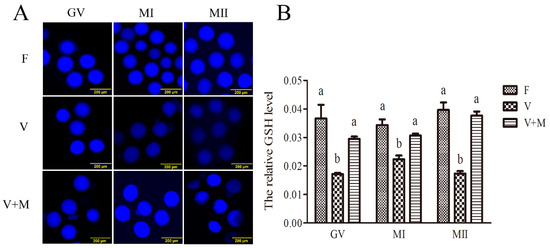 Effects of melatonin (MT) on GSH levels in vitrified-warmed mouse GV oocytes during in vitro maturation. (A): Representative fluorescence images depicting GSH levels in vitrified-warmed mouse oocytes at different stages of development (GV, MI, and MII). The oocytes were treated with CMF2 H for detection of GSH levels (blue). Fresh control (F), vitrification (V), and vitrification + MT (V + M). Scale bars = 200 μm. (B): Quantification of relative levels of GSH in oocytes. Fluorescence intensities of GSH levels were measured with ImageJ software. Data are presented as mean ± SEM of three independent experiments. Total number of GV oocytes used in this assay n = 352 (F: n = 116; V: n = 115; V + M: n = 121). Different superscripts (a and b) indicate significant difference (p < 0.05) between groups at the same time point (at corresponding developmental stages).
