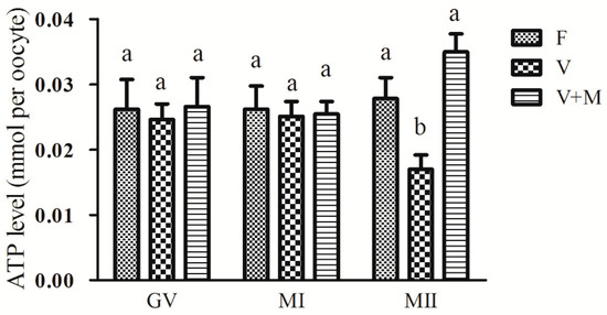 Effects of melatonin (MT) on ATP content in vitrified-warmed GV-stage mouse oocytes during in vitro maturation. ATP contents were evaluated in vitrified-warmed mouse oocytes at different stages of development (GV, MI, and MII). Fresh control (F), vitrification (V), and vitrification + MT (V + M). Total number of GV oocytes used in this assay n = 335 (F: n= 103; V: n = 121; V + M: n = 111). Data are presented as mean ± SEM of three independent experiments. Different superscripts (a and b) indicate significant difference (p < 0.05) between groups at the same time point (at corresponding developmental stage).