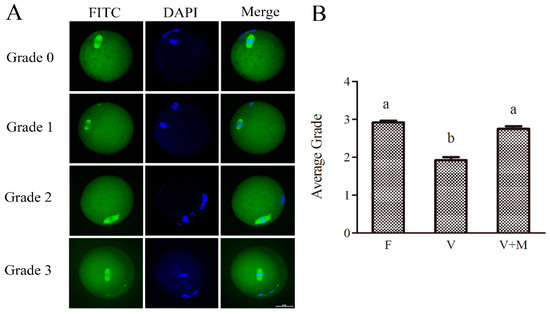 Effects of melatonin (MT) on spindle morphology of vitrified-warmed GV mouse oocytes during in vitro maturation. Spindle morphology scores were assessed in GV oocytes maturing to MII stage. (A): Grades of spindle morphology. Fresh control (F), vitrification (V), and vitrification + MT (V + M). Grade 0 = severely diminished spindle, i.e., that is less than 50% of the normal spindle in size. Grade 1 = mildly diminished spindle, i.e., larger than 50% of the normal spindle. Grade 2 = severely increased spindle i.e., larger than the normal spindle in size. Grade 3 = equivalent to the normal spindle in size and shape. Scale bar = 20 μm. (B): Average grade of spindle morphology in different groups. In total, GV oocytes were used in this assay n = 220 (F: n = 58; V: n = 87; V + M: n = 75). Data are presented as mean ± SEM of three independent experiments. Values with different superscripts (a and b) are significantly different (p < 0.05).
