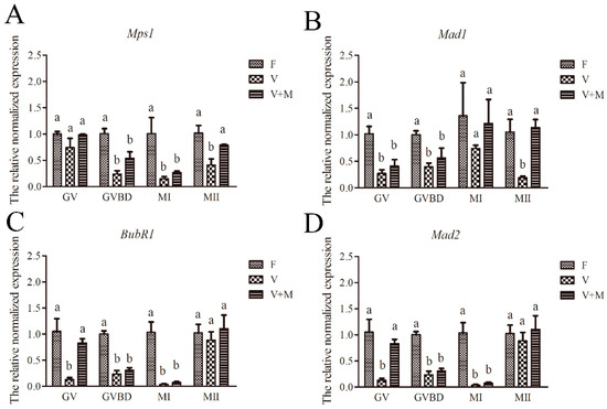 Effects of melatonin (MT) on relative mRNA expression of spindle assembly checkpoint-related (SAC) genes in vitrified-warmed GV mouse oocytes during in vitro maturation. Data are presented as mean ± SEM. The experiment was replicated at least three times. In total, n = 924 GV oocytes were used for mRNA expression analysis (F: n = 302; V: n = 323; V + M: n = 299). Different superscripts (A–D) indicate significant difference (p < 0.05) between groups at the same time point (corresponding developmental stages). F: fresh control oocytes without MT. V: vitrified MII oocytes without MT. V + M: vitrified MII oocytes treated with 10−7 mol/L MT. Different superscripts (a and b) indicate significant difference (p < 0.05) between groups at the same time point (at corresponding developmental stage).