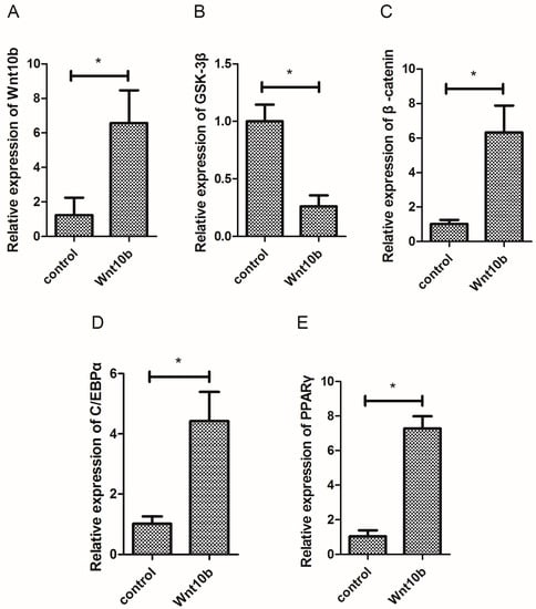 3.1. Effect of Wnt10b Gene Overexpression on the Gene Expression of Wnt10b, GSK-3β, β-catenin, C/EBPα, and PPARγ
